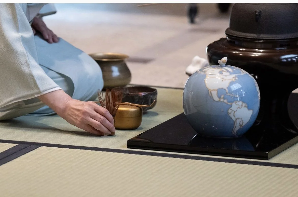地球の形をした水指。茶碗は世界各国から集められたもの。